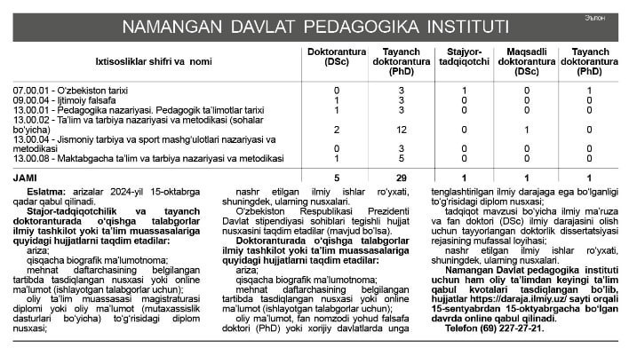 Namangan davlat pedagogika instituti 2025-yil uchun Oliy ta’limdan keyingi ta’lim kvotalari bilan tanishish; (https://t.me/Namdpi_Ilmiy/342)